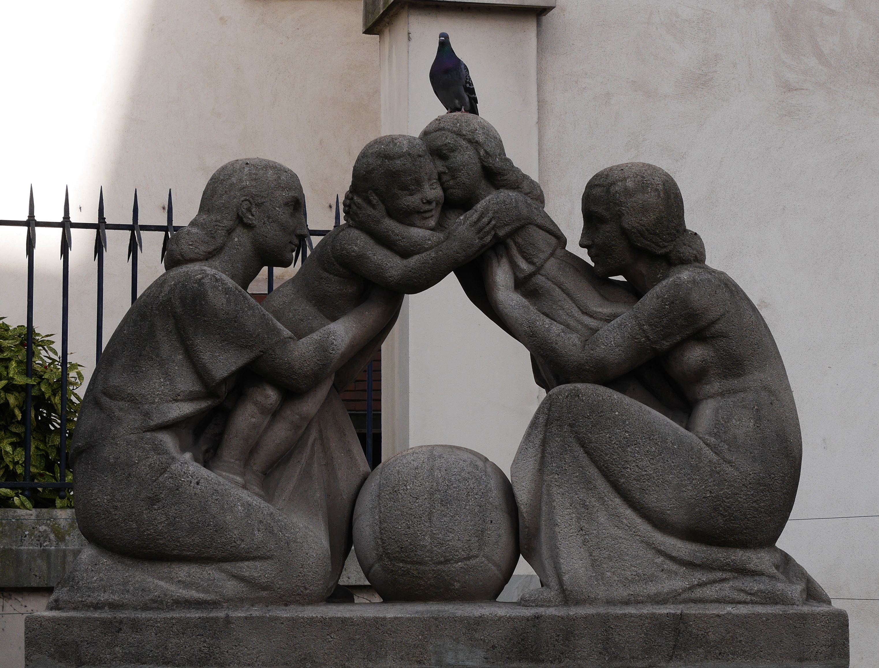 Dans le square Saint Laurent au sud de l’église du même nom, La réconciliation d’Elie-Jean Vézien trouve parfaitement sa place au milieu des cris des enfants.